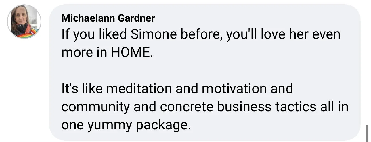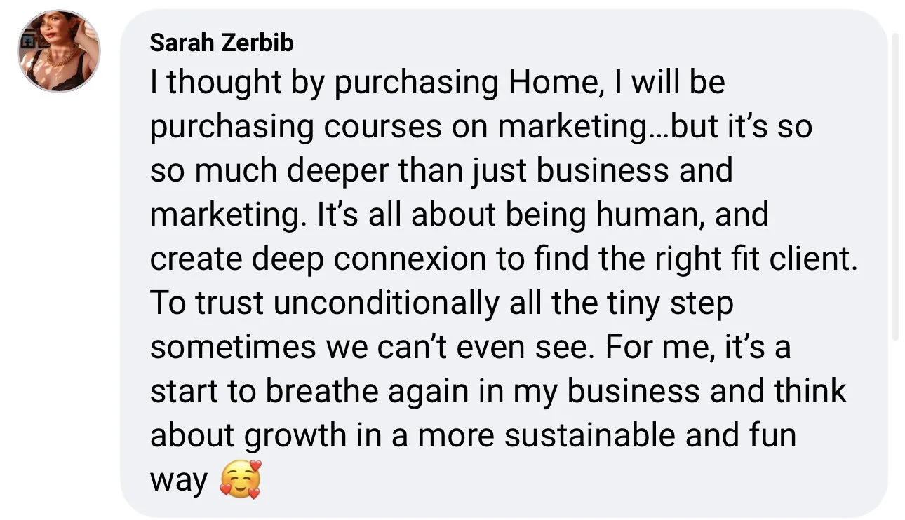 I know that because the #1 feedback I’ve gotten from clients is, “You teach marketing on the surface, but you really teach how to come home to yourself.”
