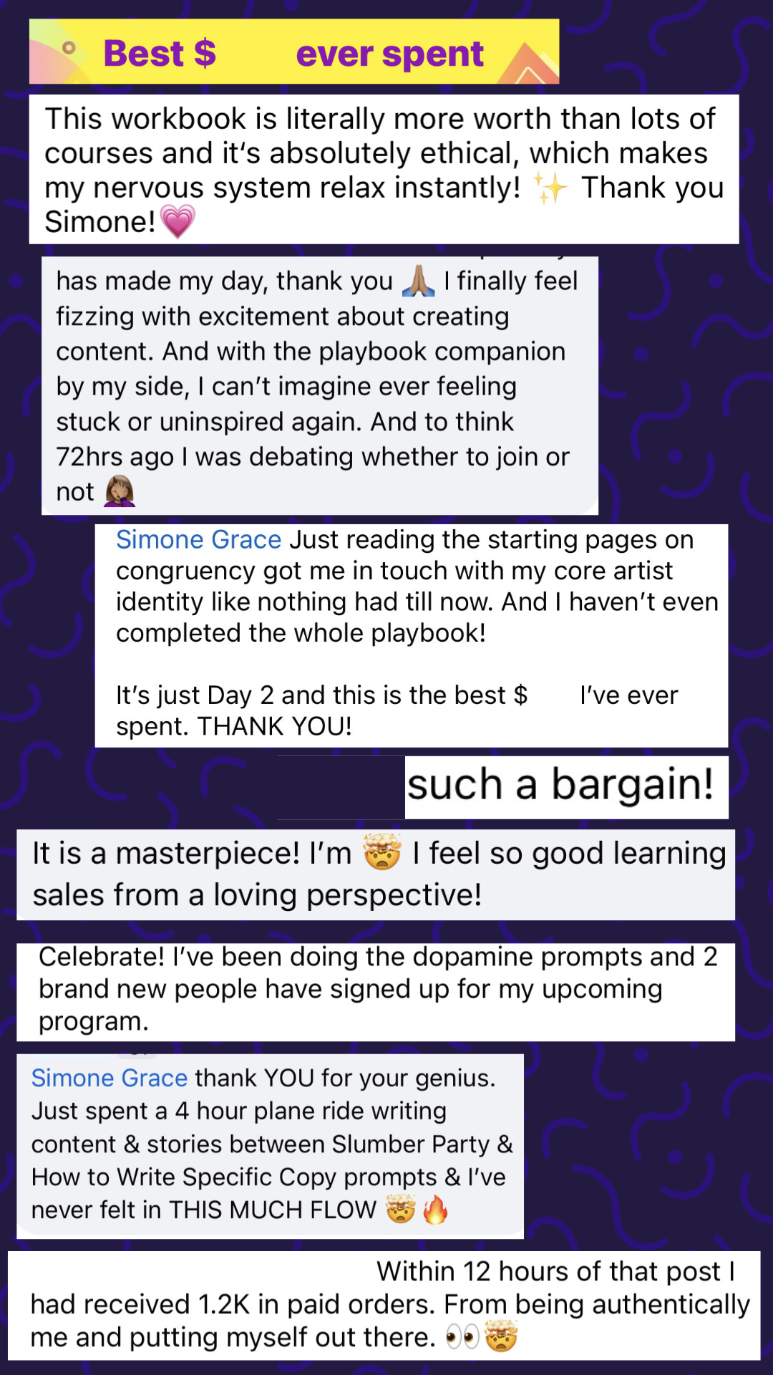Highlights from the pop-up Facebook group — value-packed coaching replays from Simone and the party chaperones