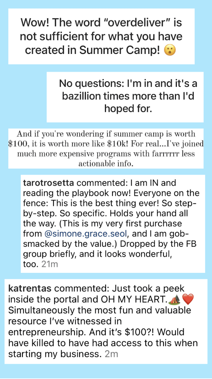 “Summer Camp might have just been the biggest transformation my business has ever seen. With no drama, I swiftly decided to offer mini Astrology readings… and 5 people booked. This is the most action and love my business has ever gotten. I believe I’ve finally connected to the Spirit of my Business.”